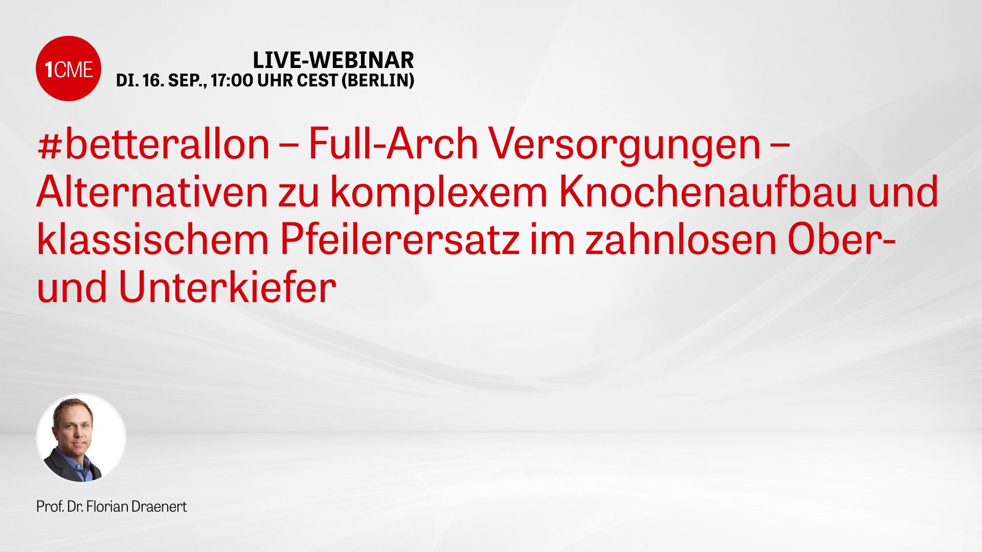Im Webinar zum Thema „#betterallon – Full-Arch Versorgungen – Alternativen zu komplexem Knochenaufbau und klassischem Pfeilerersatz im zahnlosen Ober- und Unterkiefer“ zeigte Prof. Dr. Dr. Florian Guy Draenert die Optionen in diesem Zusammenhang auf und stellt auch die Bedeutung von Implantatdesigns für den Erfolg der Versorgung dar. Ebenso wurden die entsprechenden Versorgungskonzepte der ersten und dritten Generation erklärt und es wird klargestellt, dass der volldigitale Workflow, der von der Industrie heutzutage gerne favorisiert wird, viele Probleme aufweist.