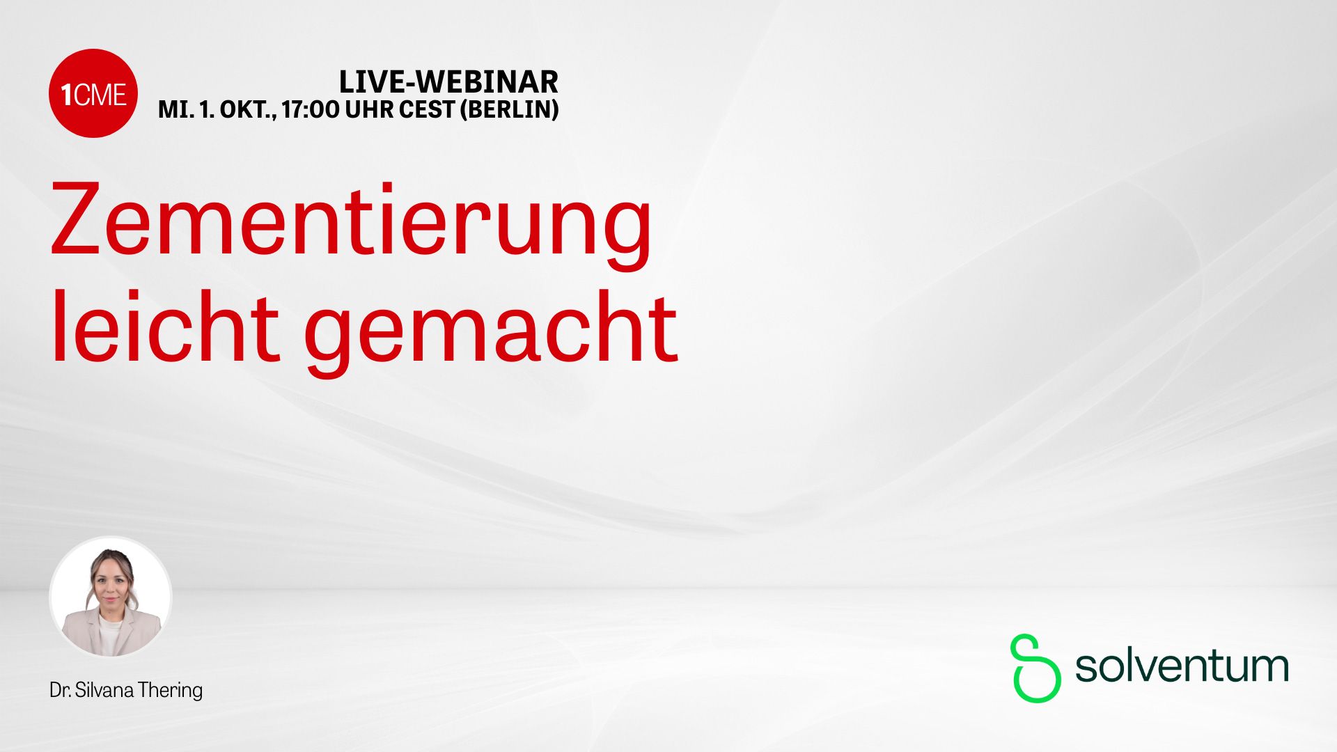 Hilfestellung bietet das Webinar mit Dr. Silvana Thering (Fachzahnärztin für Prothetik) und Sigrun Ratzer (Clinical Advisor und Chemieingenieurin bei Solventum) zum Thema „Zementierung leicht gemacht“. Die Referentinnen widmen sich den möglichen Herausforderungen und potenziellen Fehlerquellen im Prozess, zeigen Lösungswege auf und geben den Anwesenden einen praktischen Leitfaden an die Hand, mit dem sich Entscheidungen einfacher treffen, Arbeitsabläufe optimieren und vorhersagbare Ergebnisse erzielen lassen.